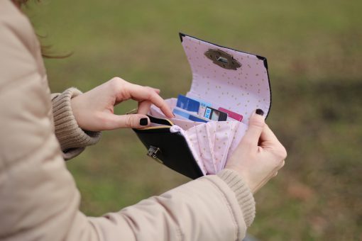 Verschlossen wird die Little Ruby Geldbörse mit einem Druckknopf – wahlweise an einer Verschlusslasche. Wähle aus 3 Laschen-Formen: spitz, rund oder eckig. Ohne diese Lasche kannst du auch andere Verschlüsse verwenden. Diese sind nicht im Ebook veranschaulicht, aber auf meiner Website findest du einige kostenlose Tutorials hierzu. Verwende lieber keinen Magnetverschluss, da dieser die Chipkarten löschen könnte.
