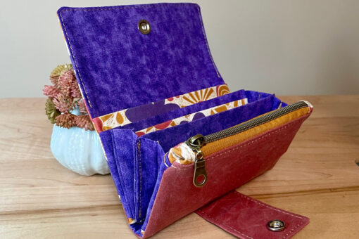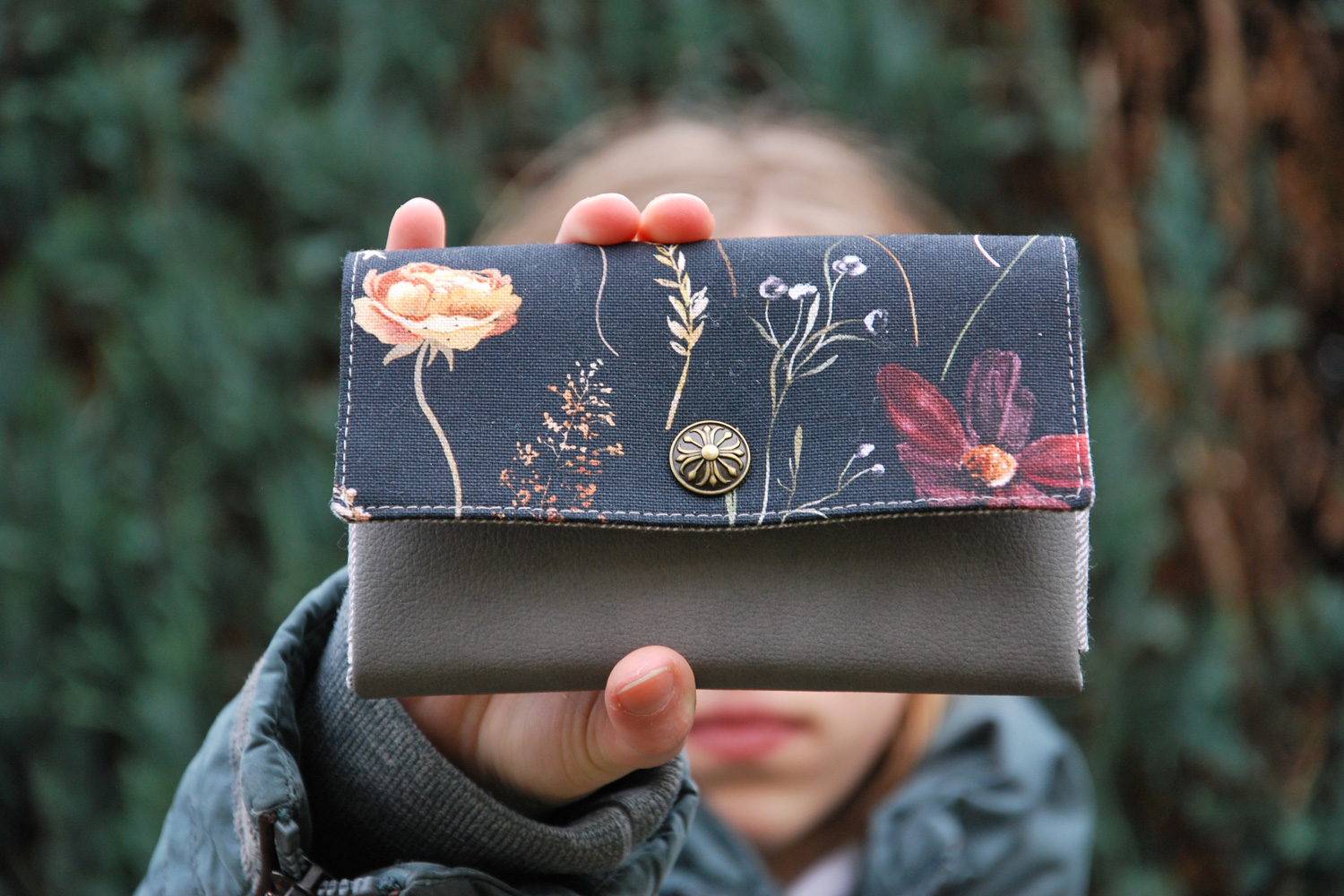 Auf Absteppnähte rundherum wird verzichtet (außer an der Klappe), was es einfacher macht, die Geldbörse zu nähen. Dank der empfohlenen Einlagen wird die Geldbörse schön stabil und liegt gut in der Hand. Wähle aus zwei Klappenformen.