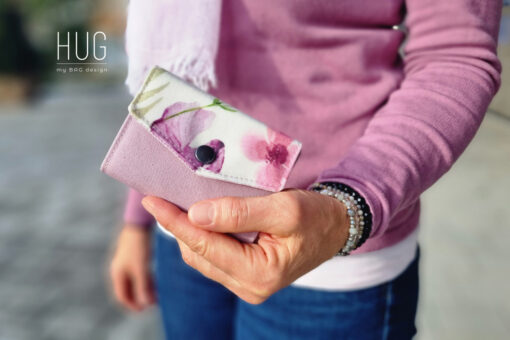 Verschlossen wird die Mini Ruby Geldbörse mit einem Druckknopf – wahlweise an einer Verschlusslasche (zwei Laschen-Optionen, je eine für dünne und eine für dicke Stoffe sind enthalten). Ohne diese Lasche kannst du auch andere Verschlüsse verwenden. Diese sind nicht im Ebook veranschaulicht, aber auf meiner Website findest du einige kostenlose Tutorials hierzu. Verwende lieber keinen Magnetverschluss, da dieser die Chipkarten löschen könnte.
